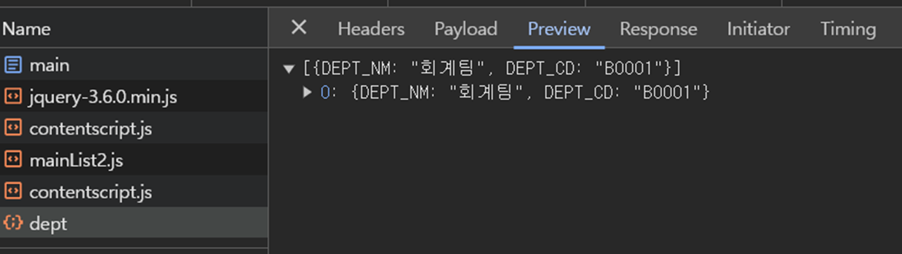 3) 버튼을 클릭하여 서버 요청이 전송되면 좌측 Name 탭에 요청(dept)이 보여집니다.