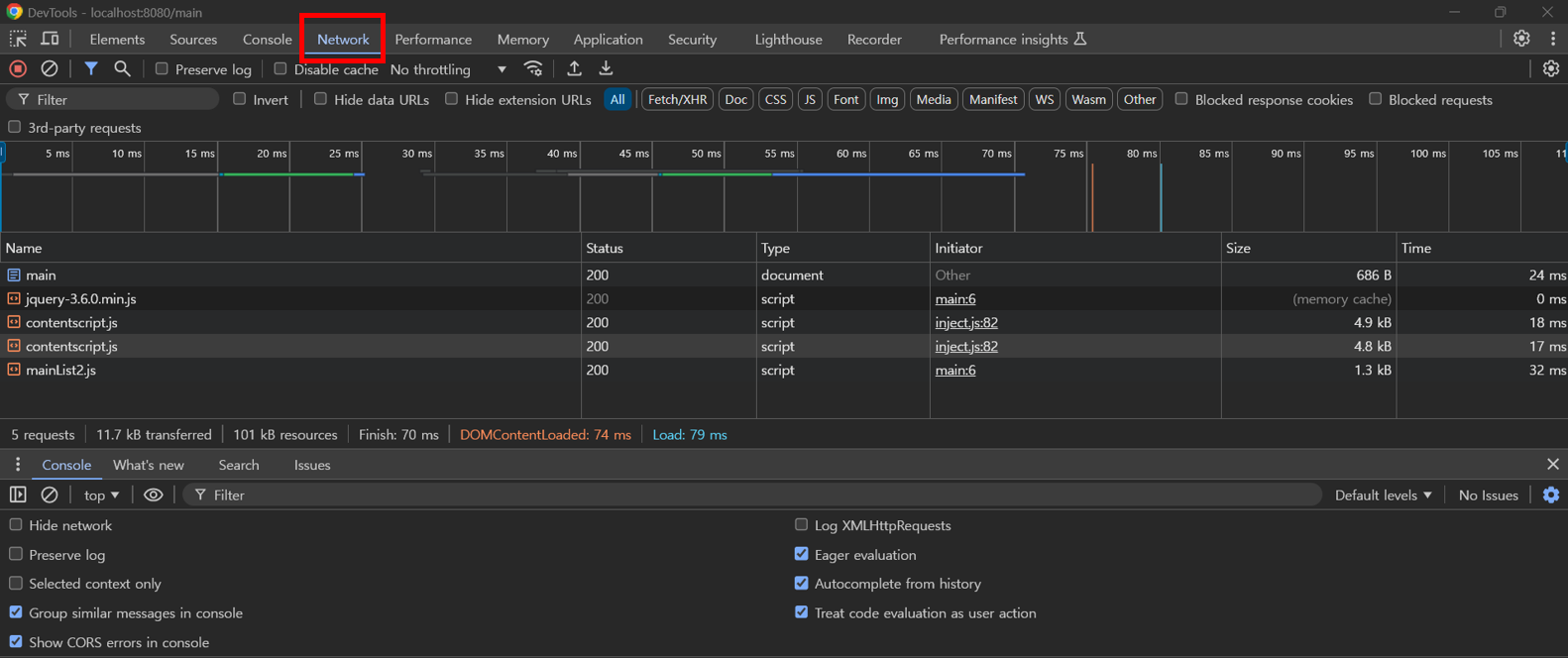 1) 개발자 모드로 진입 후 네트워크 탭으로 이동합니다. (진입방법)