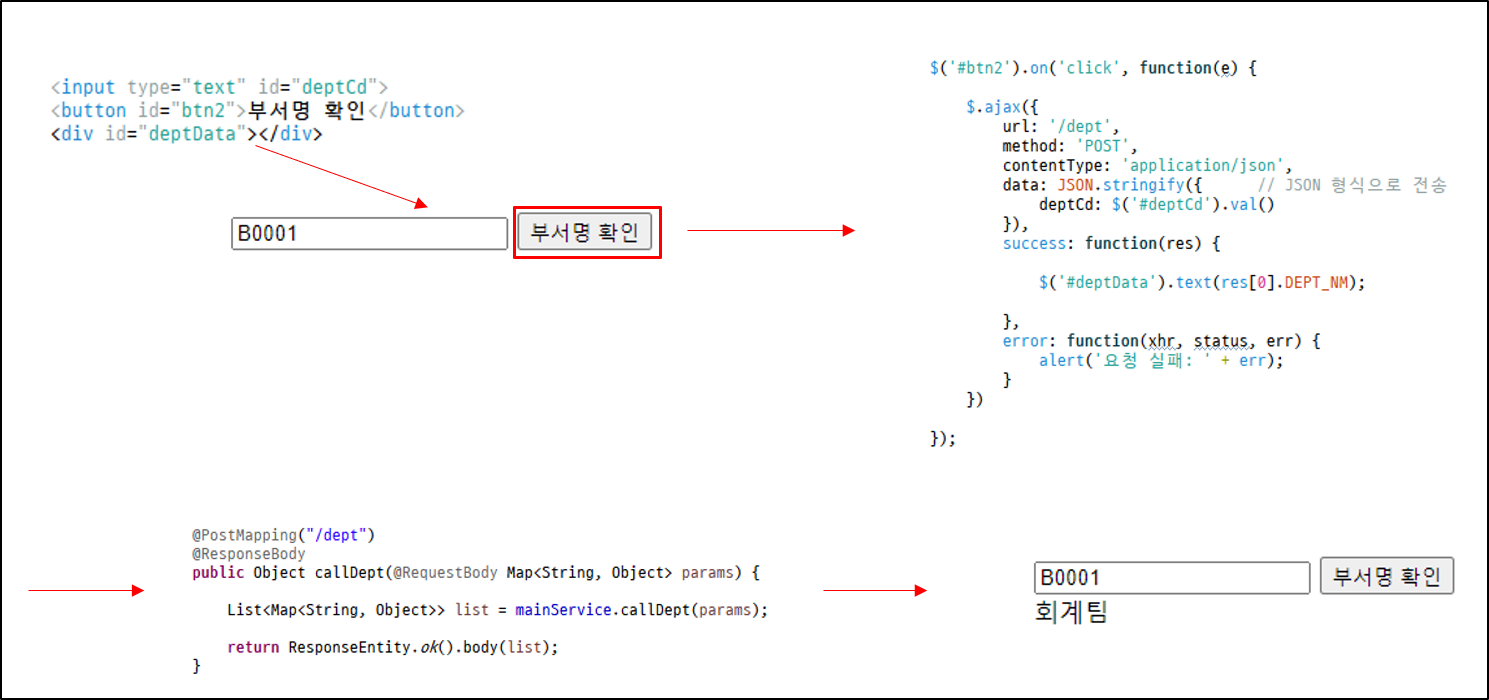 1-1) 부서코드를 입력 후 부서명 확인 버튼 클릭 시 서버로 ajax요청이 전송되고, 서버에서 부서명을 리턴해줍니다.